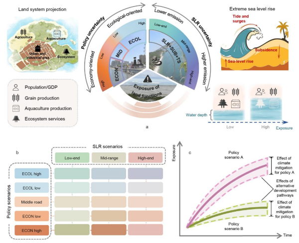 隨著氣候變暖,海洋熱膨脹與冰蓋融化推動全球海平面不斷上升。然而在許多地區,陸地本身也在下沉——通常源于地下水開采和過度開發——這進一步加劇了沿海洪水風險。當上升的海水遇到下沉的陸地,當地海平面上升的速度可能會顯著加快。沿海開發決策同樣關鍵:開發決策不僅使更多人口與資產暴露在風險之中,還可能加劇地面沉降,從而放大局地海平面上升的效應。然而,在未來氣候變化和全球政治經濟格局高度不確定的背景下,沿海開發政策本身也存在不確定性。政策不確定性如何與海平面上升、極端風暴潮等為代表的氣候因素、以及氣候與人類活動共同驅動的地面沉降進行動態交互,共同作用于未來沿海洪水風險的暴露影響,是待解之謎。